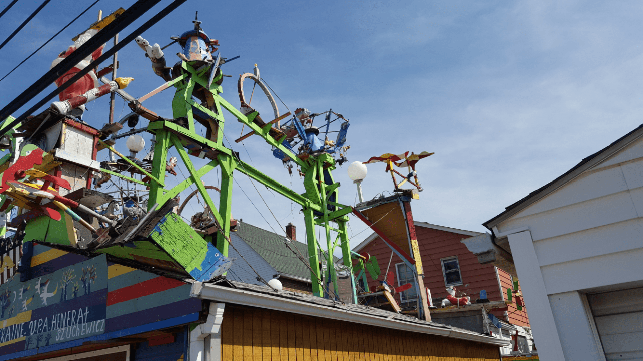After retirement, Szylak wanted a hobby, so he started building a large piece of artwork in his backyard out of various objects (old, new, blue… if it was borrowed, they never got it back!). This art grew larger and larger over the years until it became the mammoth sculpture that it is today, towering over the back fence and eventually well over the two garages at the base. This art is known as HAMTRAMCK DISNEYLAND- 12087 Klinger St., Hamtramck, MI.