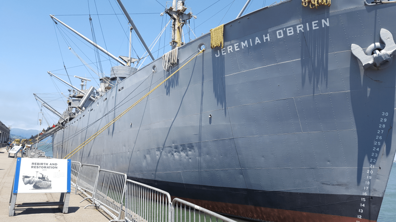 The S.S. Jeremiah O’Brien is a 441-foot Liberty ship (cargo ship from WWII) and is the only American vessel still around today known to have been a part of the Normandy invasion team. The ship has been maintain and restored to be as it was in 1944… yet as a floating museum, so… a 1944 WWII cargo vessel with some museum exhibits in it.